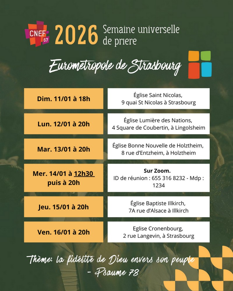 Du 11 au 18 janvier 2026, nous nous joignons aux Églises partout dans le monde pour la Semaine Universelle de Prière.